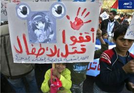 「涼宮ハルヒ」のプラカードを掲げてパレスチナ自治区でのデモ行進に参加する少女(2006年 12月 15日)