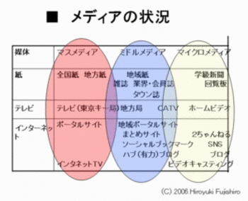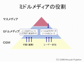 ピラミッドの頂点のマスメディアと、底辺にあるマイクロメディア(ブログ・2ちゃんねる etc.)の情報を整理するのが「ミドルメディア」であるらしい。