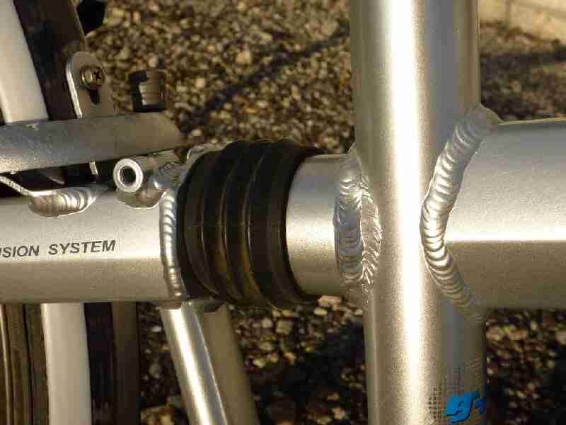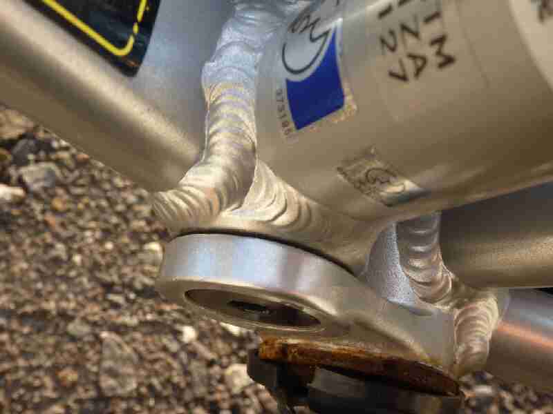 サスペンションの位置関係でトップチューブは太い六角形で、溶接も盛り上がっている。